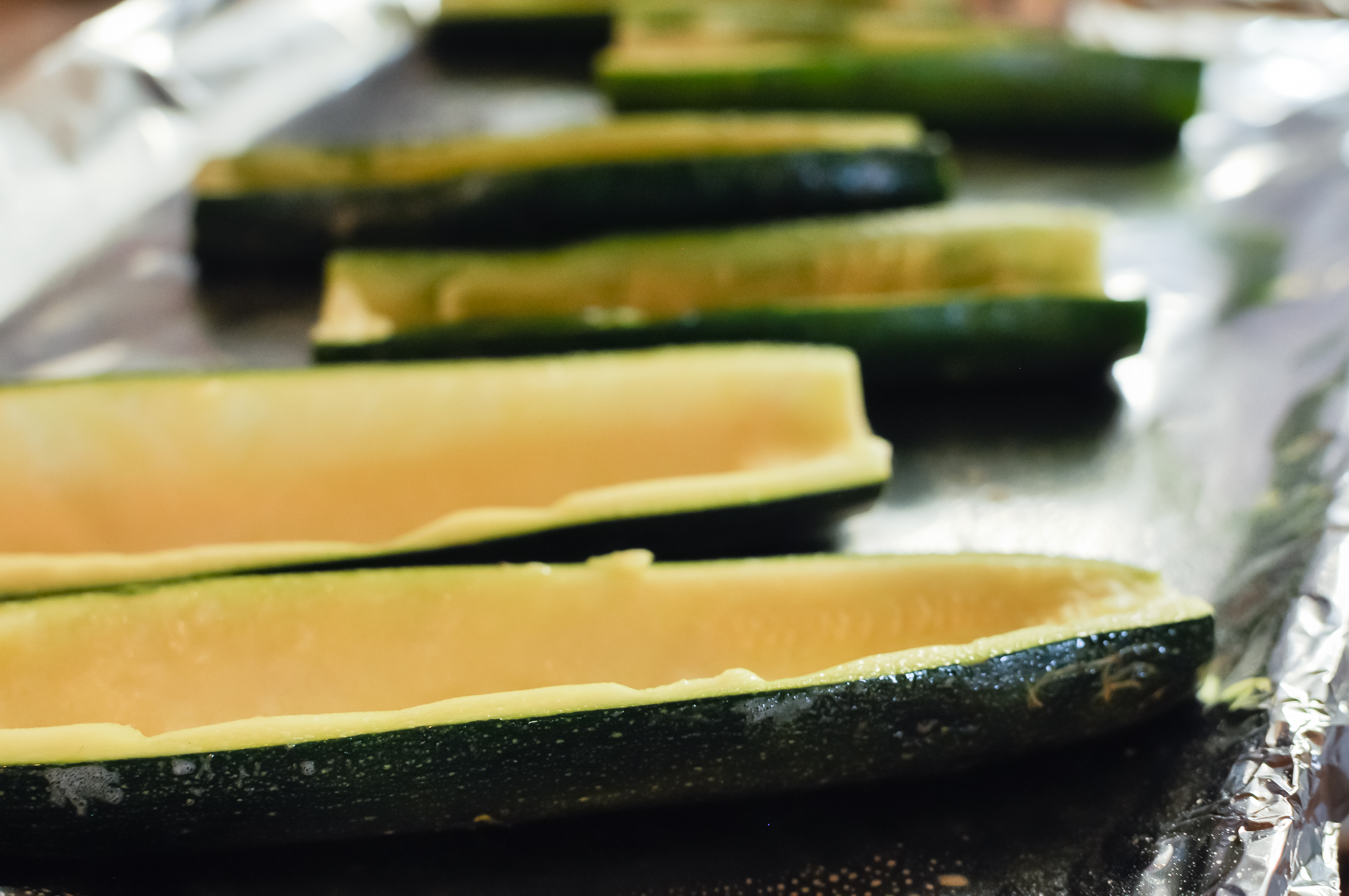 6. While meat is cooking, scoop the meat out of the zucchini with a small spoon. Place on a foiled lined baking sheet and spray with cooking spray. Cook zucchini until almost done, about 15-20 minutes. (Tip: For that extra summery grilled flavor and vertical marks, grill on the stovetop or BBQ.)