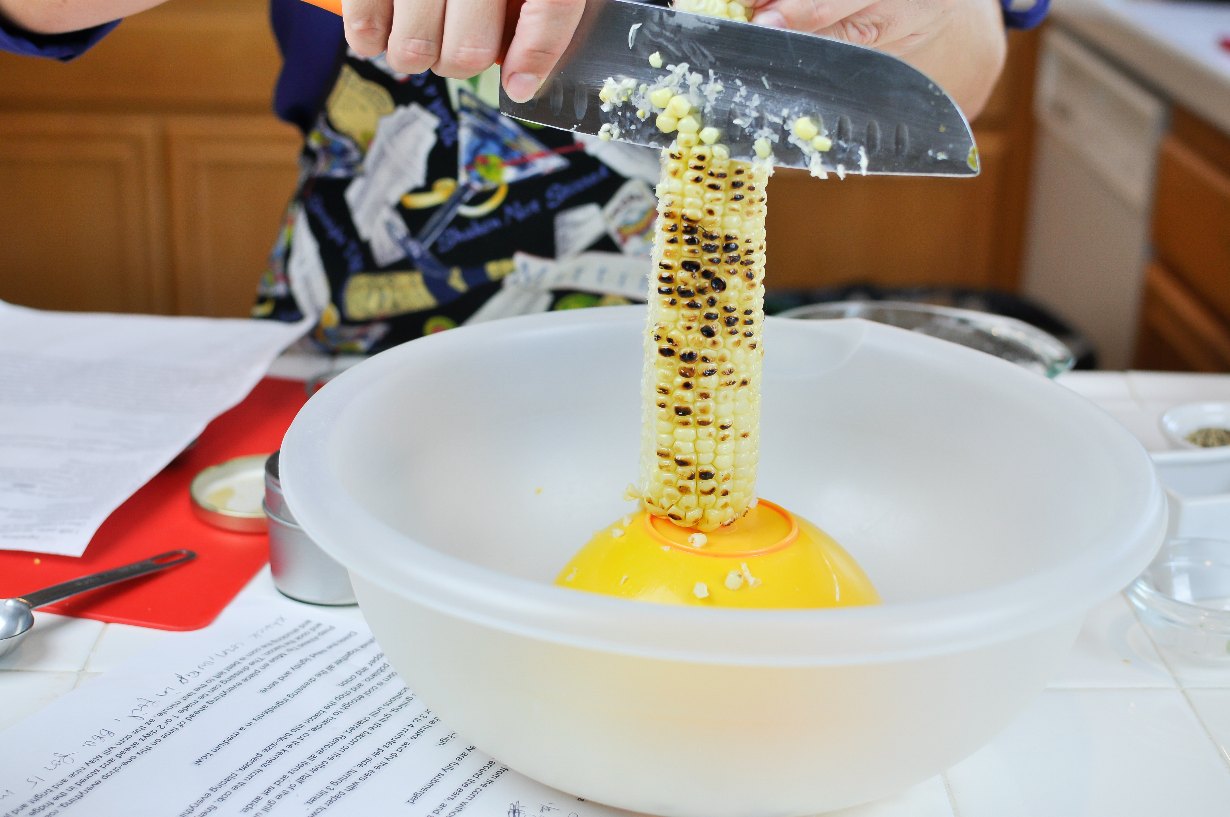 This past Sunday was our first Family Apron cooking day and what a blast we had! Being able to improvise and bounce ideas off each other was such a great experience. Tacos are so versatile, and just perfect for summer grilling. That savory charred flavor paired with bright toppings is a fabulous combination. Here’s our take on a simple, yet tasty chicken taco and a refreshing roasted corn salad on the side. -Tammy and Mel