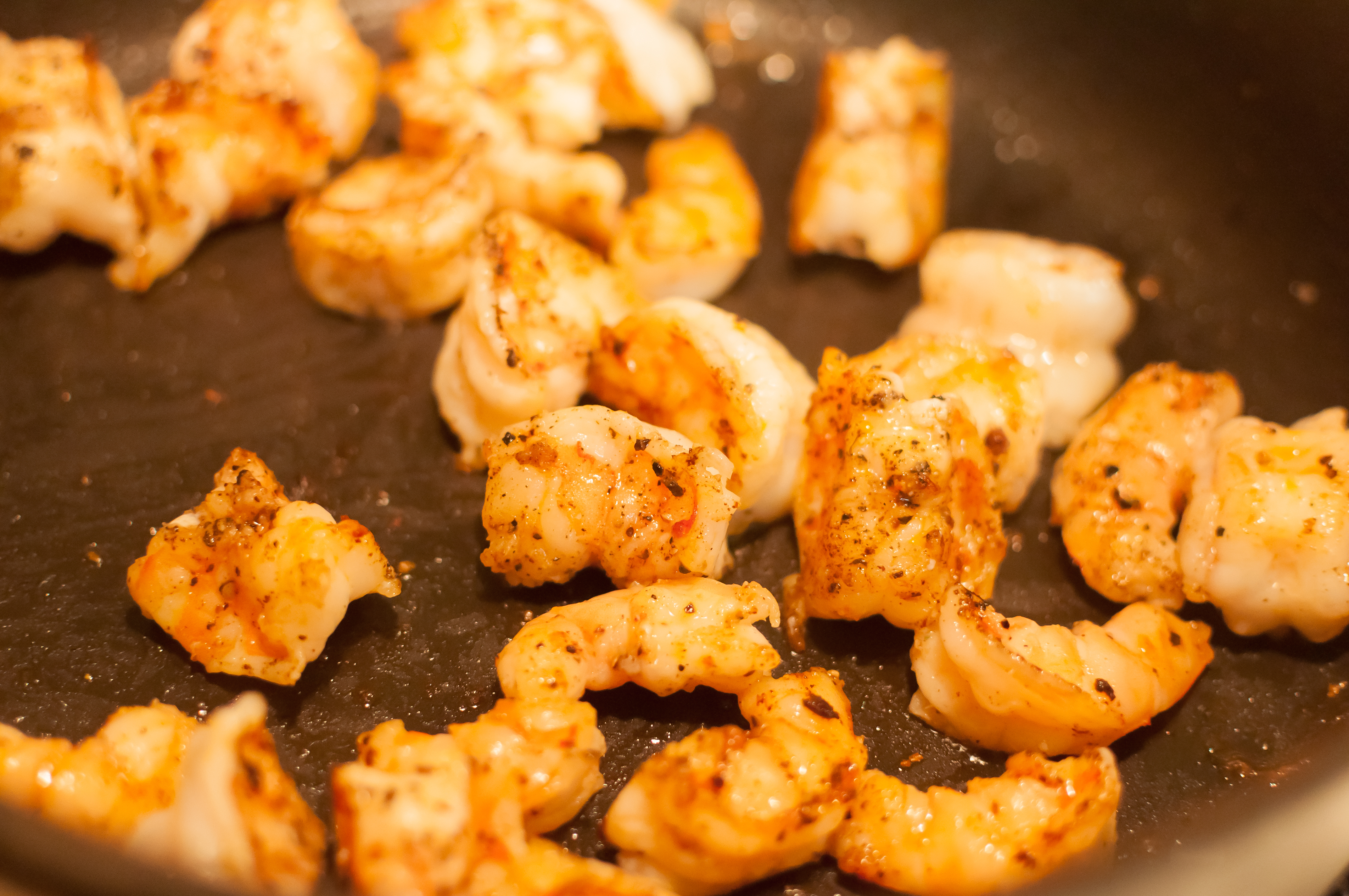 - Season the shrimp with a bit of salt if desired, but there should be some seasoning left in the pan from chicken and sausage/chorizo to flavor shrimp already. Turn heat back down to medium-high. Add more olive oil to the pan if needed and cook shrimp until just pink, opaque and butterflied, about 1 minute per side. Set aside.