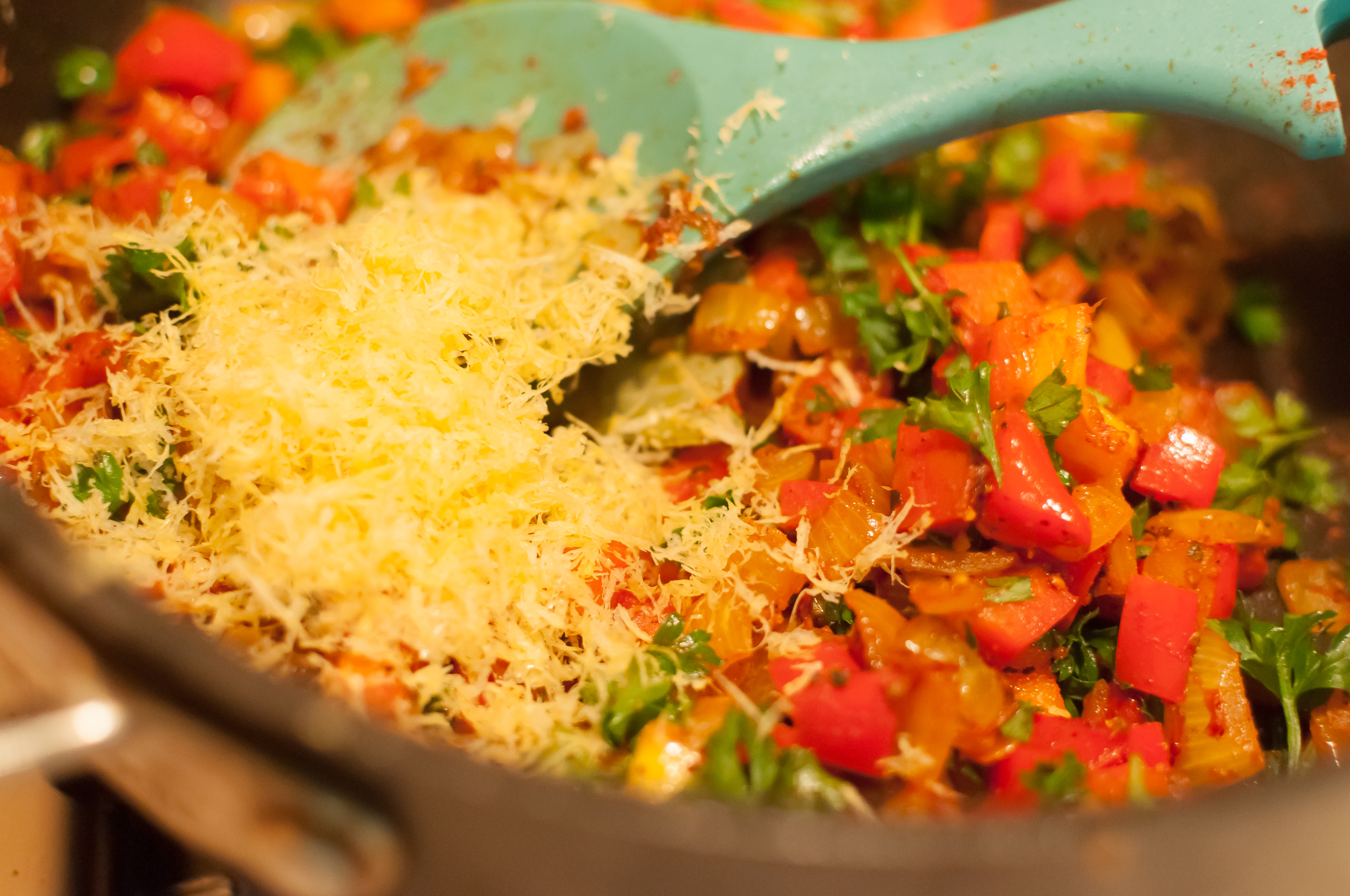 - Meanwhile, preheat oven to 350 degrees. Also, chop onions, red bell pepper and parsley, and grate/mince garlic.