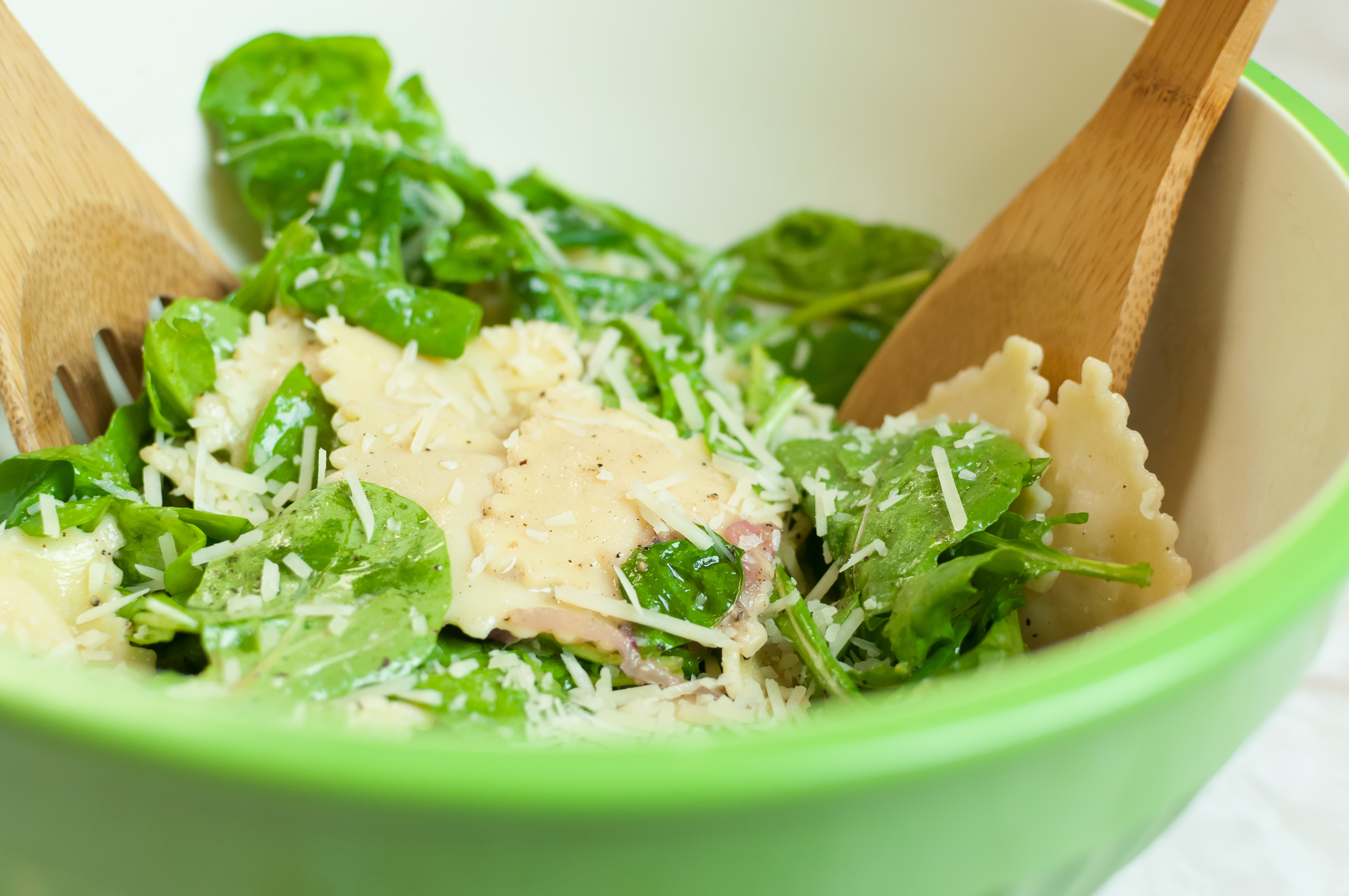 - Add ravioli and arugula to the pot and toss with warm vinaigrette dressing. Arugula will start to wilt a bit. Transfer and serve in a large bowl and toss with a bit of Parmesan. Garnish top with rest of shaved Parmesan, and freshly ground pepper if desired. Enjoy!