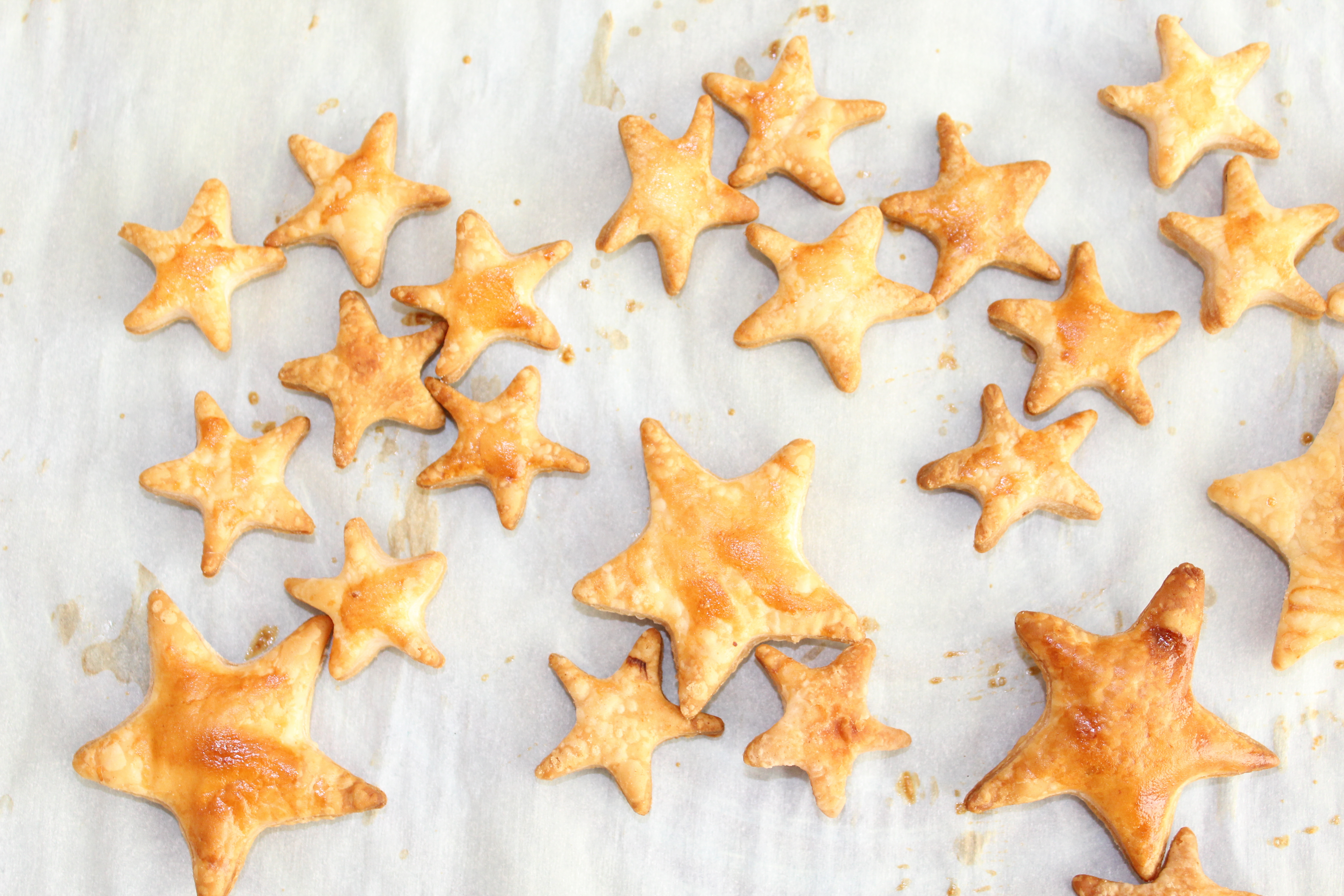 - Make the pie crust croutons. Pre-heat the oven according to package directions. Roll out the pie dough and use a cookie cutter to make cute-shaped “croutons” (I used stars). Place shapes on a parchment paper lined cookie sheet. Brush with egg wash mixture and bake. Set the timer for 7 minutes. Check the croutons to see if they are a golden brown color. You might have to bake them for a few more minutes. Mine were done after 9 minutes. Take out and cool.