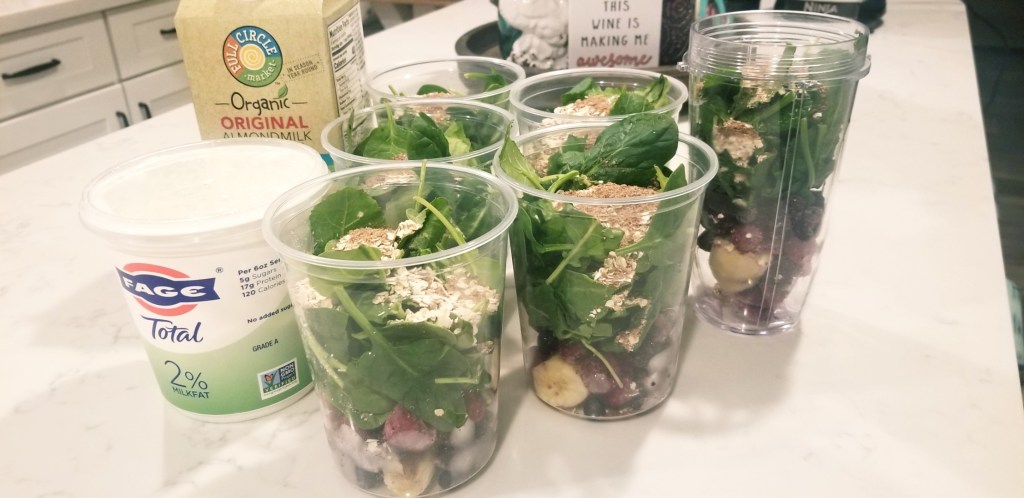 In the midst of all the Corona virus chaos, I feel so blessed with the gift of time. I feel so fortunate to be able to work with my own kids at home and have more time to cook and blog. And I know now, more than ever, is a time to stay as healthy as possible. I decided to meal prep my breakfast smoothies. I prepped 5 at a time, one for each weekday morning. I put the majority of the ingredients in a 1 quart container and into the freezer. If you don’t have containers, just use quart size freezer bags. In the morning, I throw the contents of the container into my blender and add greek yogurt and almond milk…and maybe a tiny squirt of agave if I want a touch of sweetness. I take my time drinking it because I love the flavor so much. The oats keep me filled until my lunch. Please feel free to modify this recipe to what you have in your pantry, fidge, and freezer.