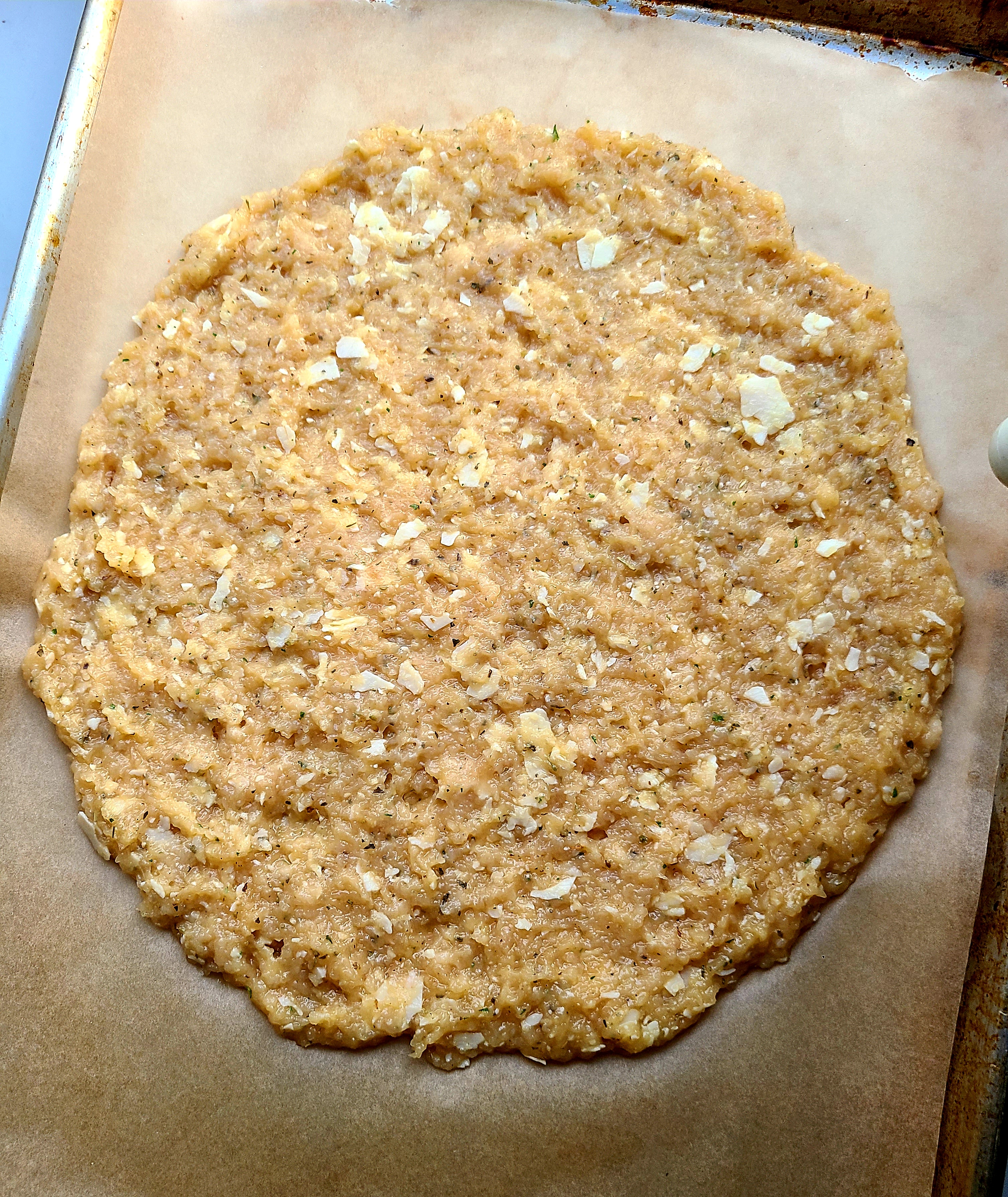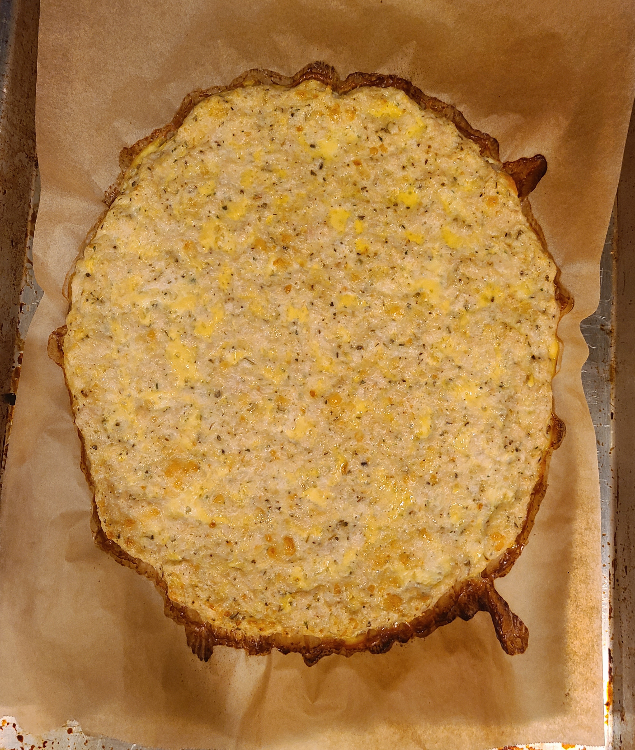 2. Mix chicken, eggs, parm cheese, Italian seasoning, and garlic together in a bowl. Do not over mix, just until it comes together. Mixture will be very wet because of the eggs. Spread onto parchment paper (on cookie sheet) into a flat circle. See photo below. Bake for 25 to 30 minutes until a very light golden color.