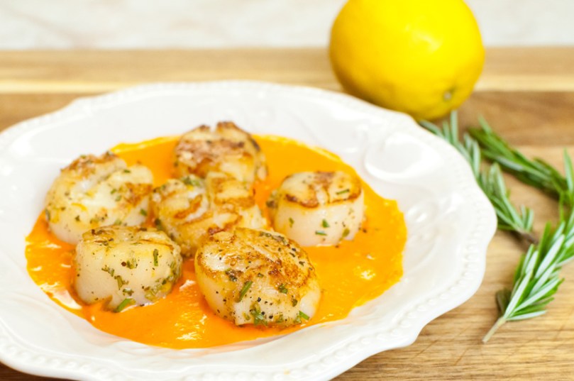 This recipe was inspired by a delicious grilled scallops and red pepper recipe I always loved by Paula Deen. But instead of roasting and wrapping red pepper around the scallops, I wanted to create a luscious, yet light and bright sauce. I saw a similar shrimp with red pepper aioli recipe that used egg yolks but wanted to cut down on the fat so I used non-fat green yogurt instead and replaced the shrimp with scallops. Scallops are not only luxurious, but actually have less cholesterol than shrimp, promote a healthy heart and are high in omega 3s! Plus, I can’t get enough of rosemary and lemon, so this recipe just sung to me. If you want to present an elegant, yet very easy and quick dish, this is the one!