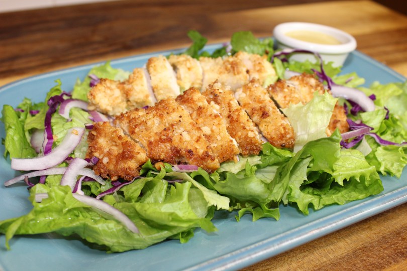 Hope you all had a fabulous Thanksgiving. I had a gut-busting great time with my family. Our day was filled with delicious food, good company, karaoke, and of course, lots of wine! And now that I have gained a few pounds; I wanted something a little lighter this week. I decided to make macadamia nut crusted chicken salad. Holy heck-a-roo, was it good! I could not scarf it down fast enough. I decided to make the chicken two ways (baked and fried); if you want it healthy or healthier, it’s up to you! Both were delicious. And the honey mustard dressing was oh, so yummy! Enjoy!
